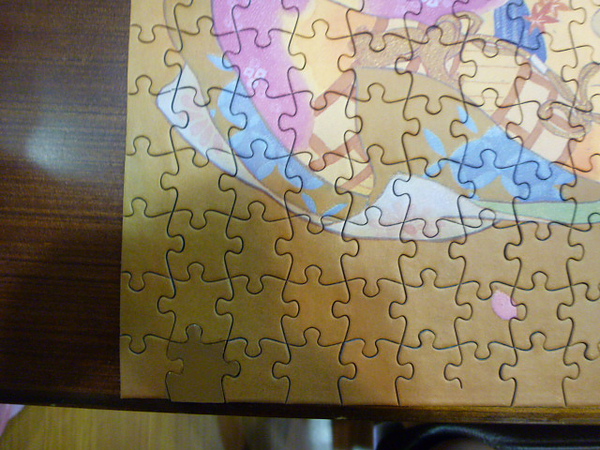 最近每週回家後都要拼一點拼圖已經變成我的例行公事了,在拼完那幅有點像發霉的孔雀開屏後,爲了要確定我其他拼圖的狀況如何,所以決定拿出一年前買的琴乃來拼拼看,唉~結果……狀況還真的不太好,琴乃的拼片倒出來後,除了屑屑多外,拼片的背後還有不少發霉(還好正面沒有,不然我一定抓狂),更扯的是,有三片切割不完全的邊邊,和一般切割不完全不一樣的是,一般至少拼片用力拉就拉的開來了,但是這幾片呢?根本是連切都沒切完,所以完全分不開……,之前拼的小熊維尼和KAGAYA明明都沒有這個問題,手感也還不錯啊?不知道是我太久沒拼台製拼圖,口味已經被日本和雷諾瓦的高品質的養慣了,還是說這幅的品質真的特別不好啊?(總覺得我在拼德珍那幅產地是大陸的出塞曲時手感和品質都比這幅好欸~)總之可以確定的是,以後春代的拼圖我絕不會再買台製的了。