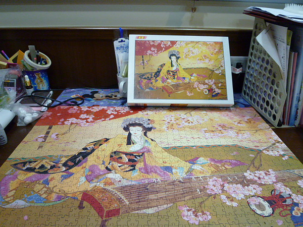 在拼的過程中那屑屑的手感實在很不好耶~感覺一直黏在手上,實在是很不舒服。而且我覺得圖片的解析度也不夠高的樣子,說好聽一點就是圖片給我一種朦朧美的感覺啦!(反正就像霧裡看花吧XD)所以也因此決定要一天把它飆完。我實在是很討厭拼片的分類,但是爲了接下來能夠快點拼完,所以還是用了一小時15分來分類,飯前花了一小時來拼邊框,和部分女子,剩下的部份也在晚餐後拼完了,恩~這幅的難度蠻簡單的,大概只有左下角的地毯咖啡色區塊有點難度,不過雖然感覺刀模好像有重複(在收的時候每十塊就感覺重複一次),但是又不像公車拼一樣可以到處放,所以我想應該是沒有拼錯啦~另外這幅非常的鬆,後來我在拿出來重拍時不小心晃到了,還弄掉一些拼片,還好弄掉的地方是人物的部份,因此重拼的過程非常順利。